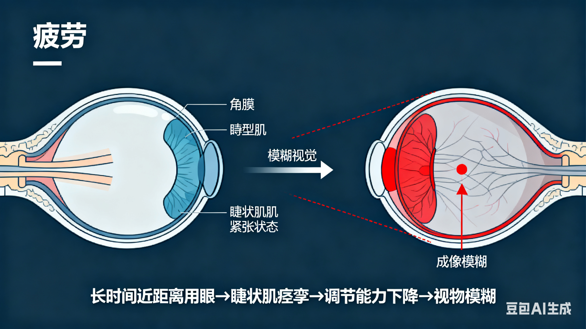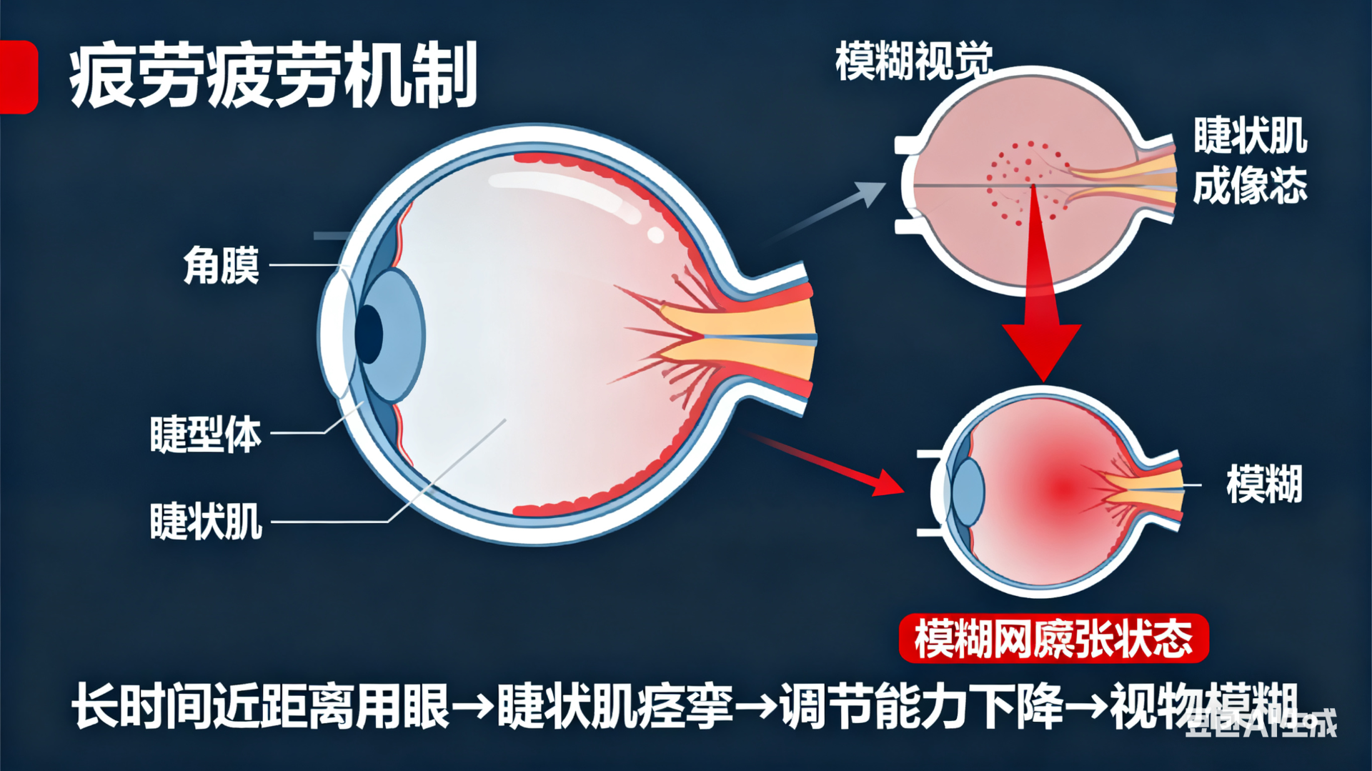 嚴重疲勞與頭痛:「長期不戴鏡:睫狀肌持續痙攣、緊繃」,導致頭痛和疲勞。