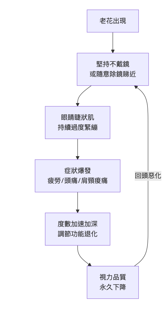 老花度數加快加深:眼睛長期處於「強行加班」狀態,會令老花度數增加速度快過正常矯正。並非因為戴鏡而加深,正係因為唔戴先至加速惡化。